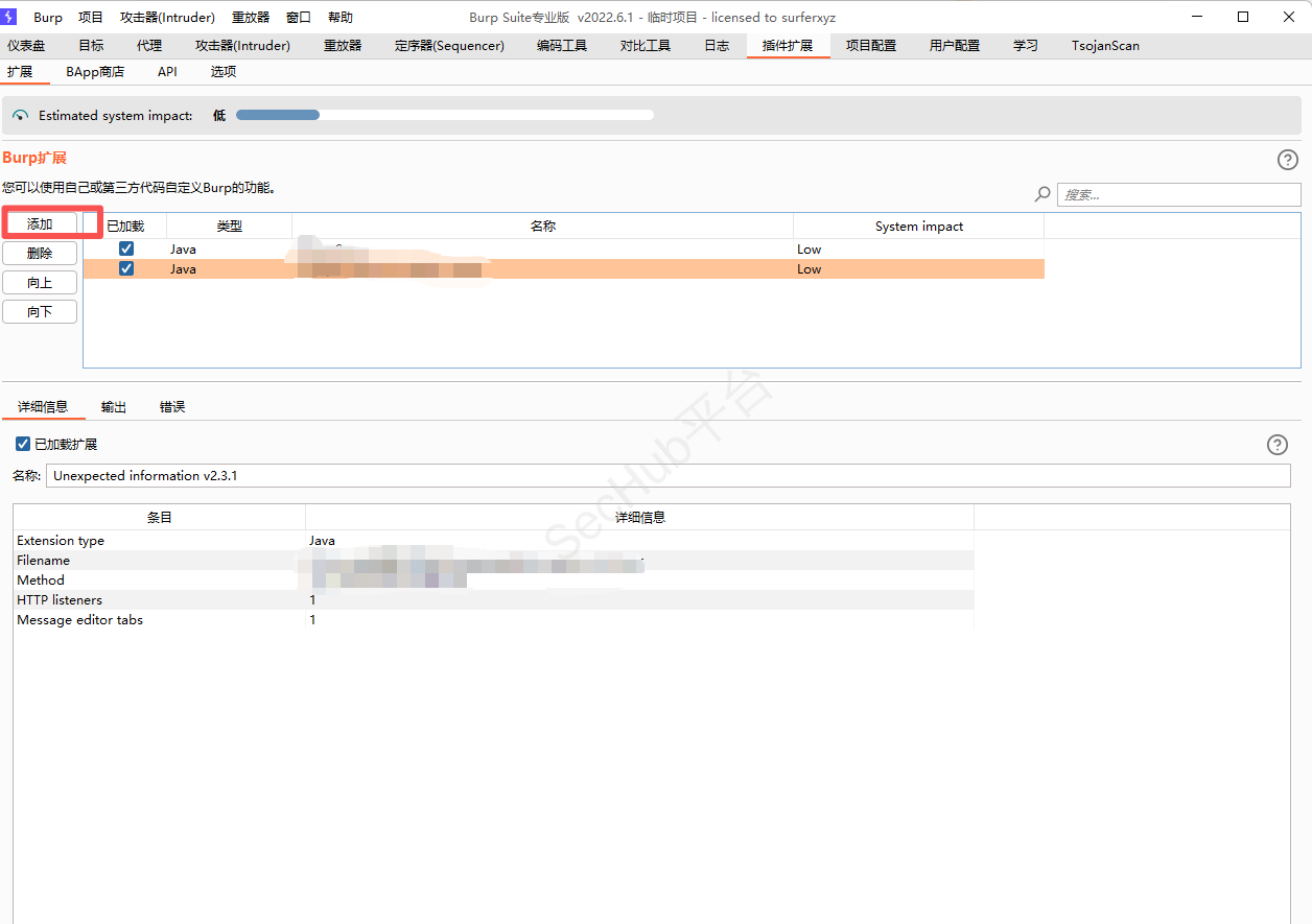 下载插件文件后,启动Burpsuite,点击插件扩展(英文是Extensions)