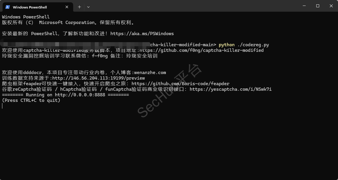 打开之前下载解压的项目源码的路径,在该路径下打开dos窗口(shift+鼠标右键,选择在此处打开powershell;),在dos界面输入“python codereg.py”,出现以下内容即代表验证码识别服务已搭建完成。