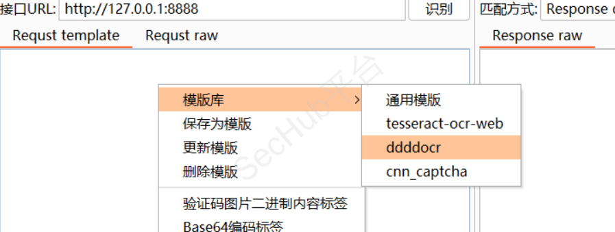 接口url填写http://127.0.0.1:8888 在 Requst template 下方空白处鼠标右键选择“ddddocr”,配置好请求模板。